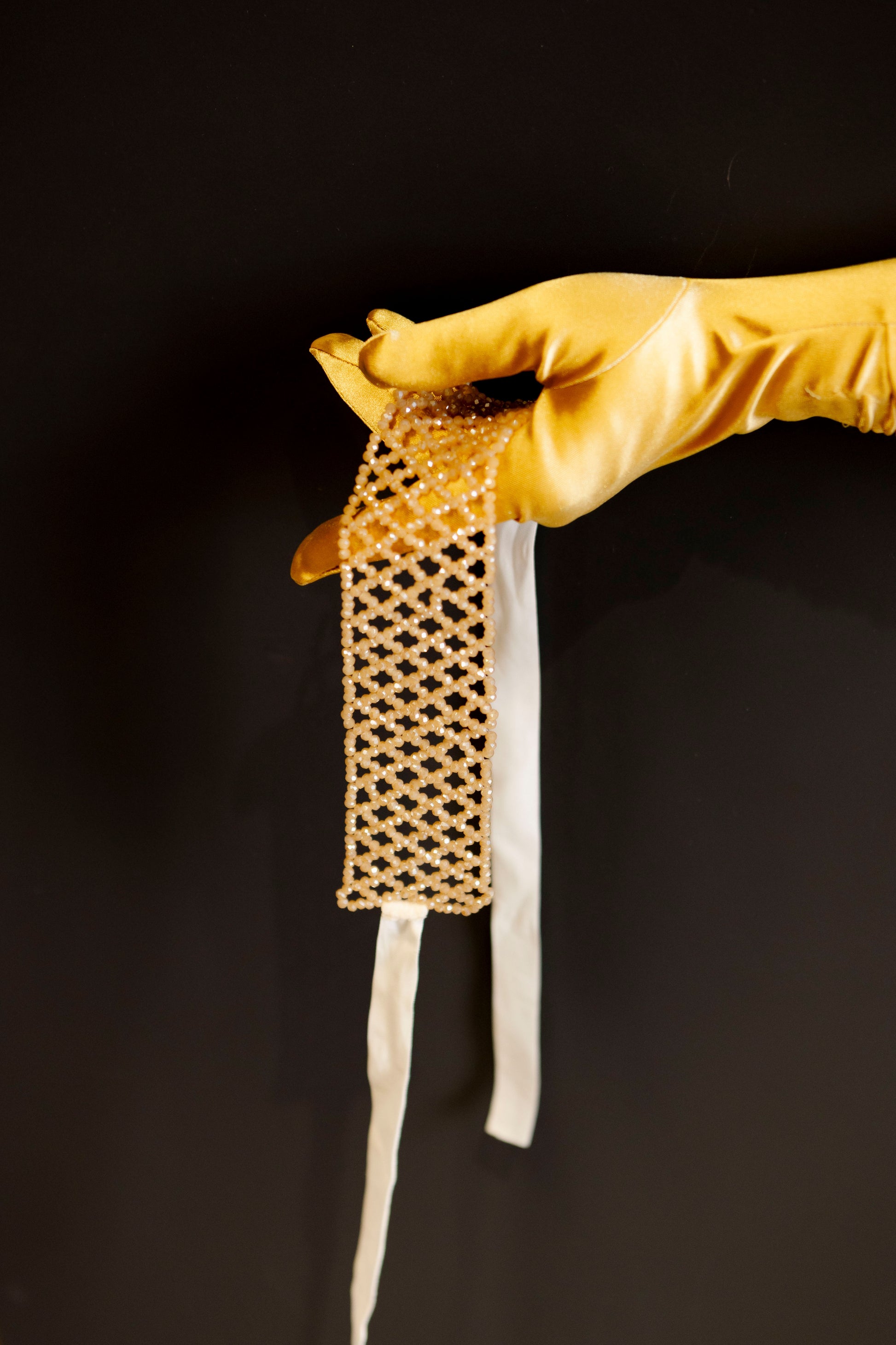 Розкішний кришталевий чокер теплого відтінку, що зав’язується на м’яку оксамитову стрічку. Кристали делікатно ловлять світло й підкреслюють шию, додаючи образу шляхетності та жіночності.