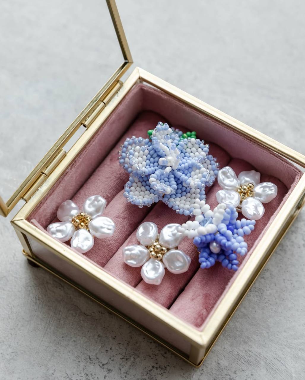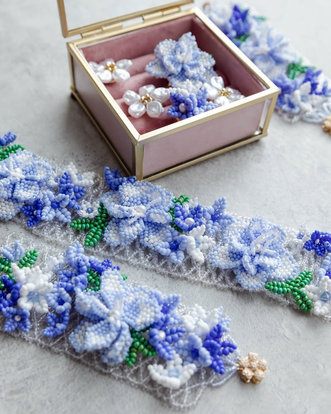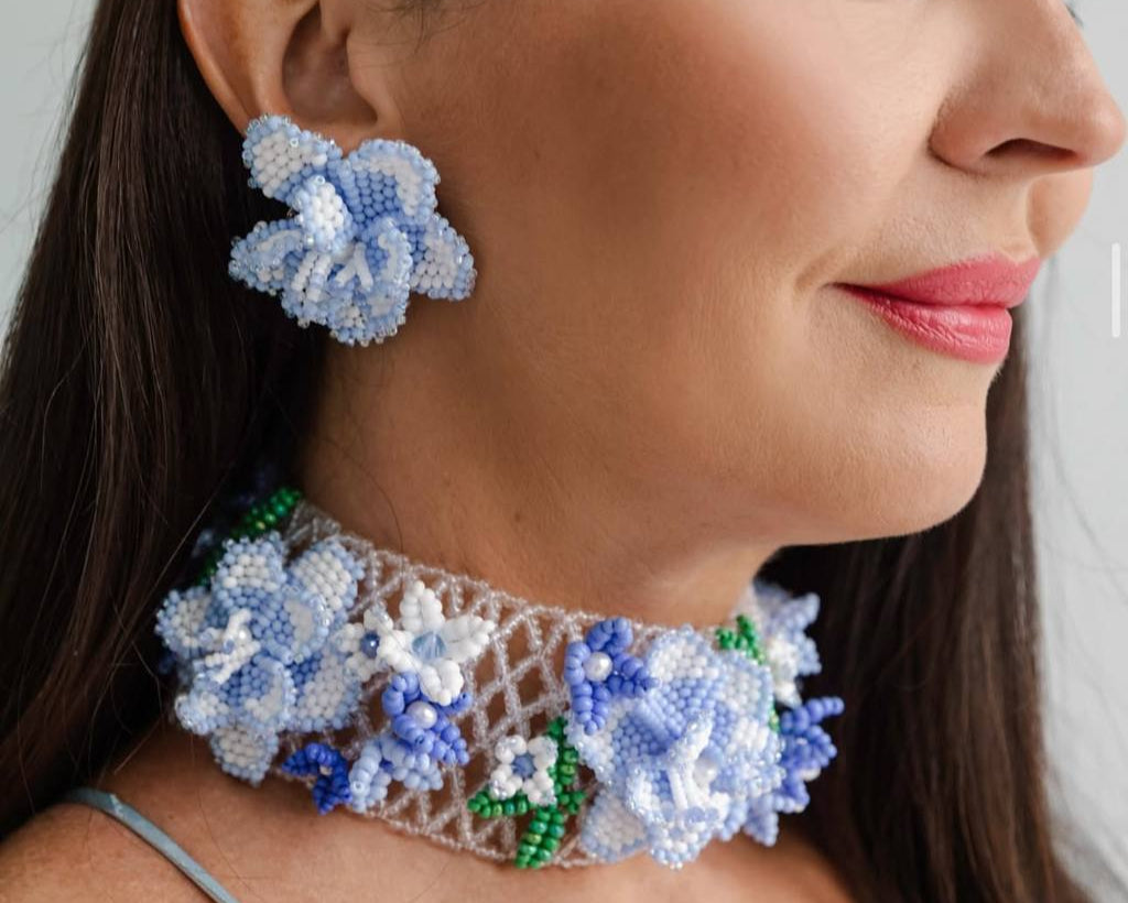 Набір Bloom — це цілий квітковий всесвіт, створений вручну з чеського та японського бісеру, кришталю й перлин. Прозорий бісер утворює майже невидиму основу, на якій розкриваються квіти, бутони та листочки, прикрашені кришталем і перлинними акцентами. Виглядає так, ніби флорист зафіксував мить цвітіння прямо у прикрасах.