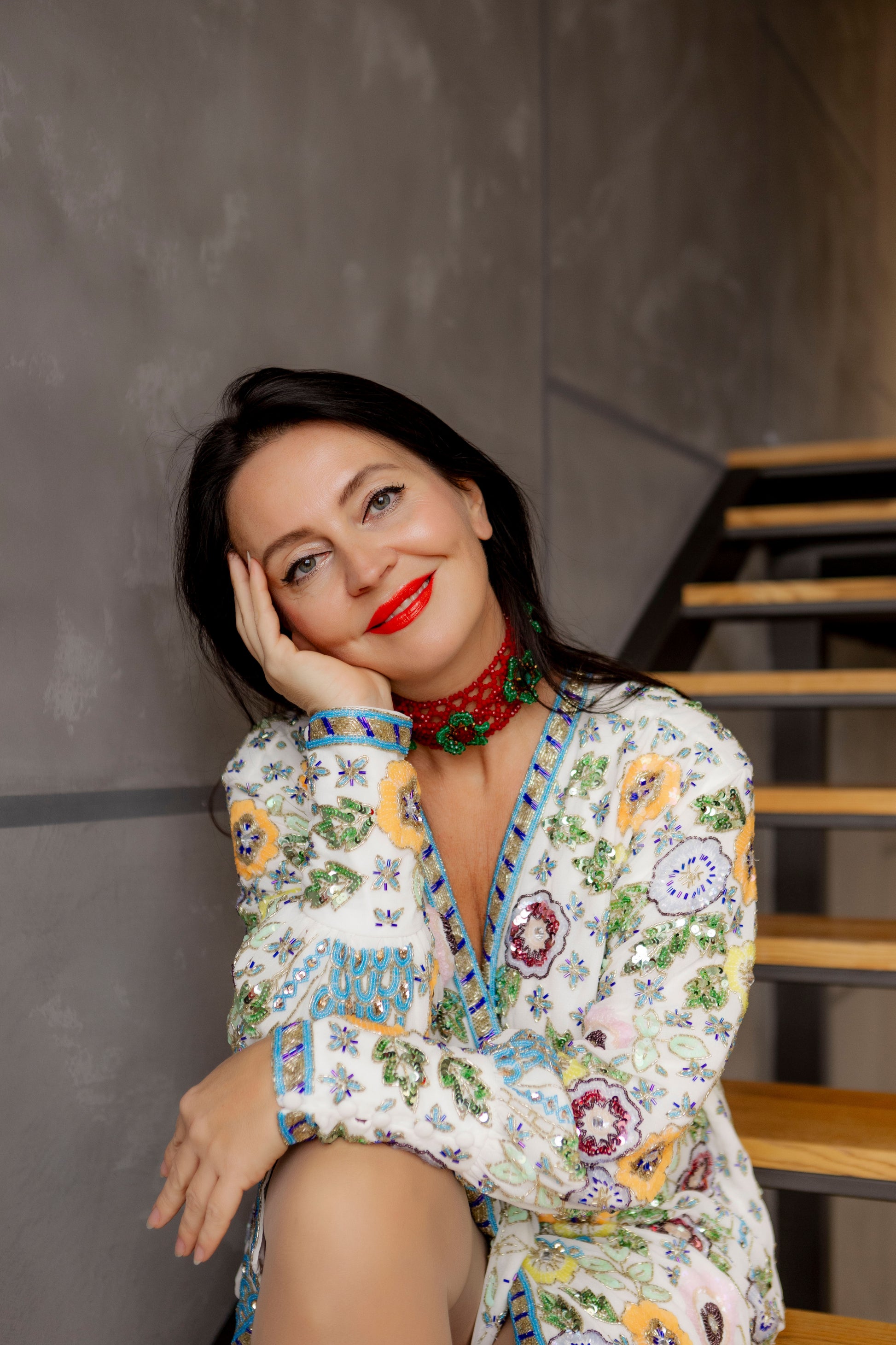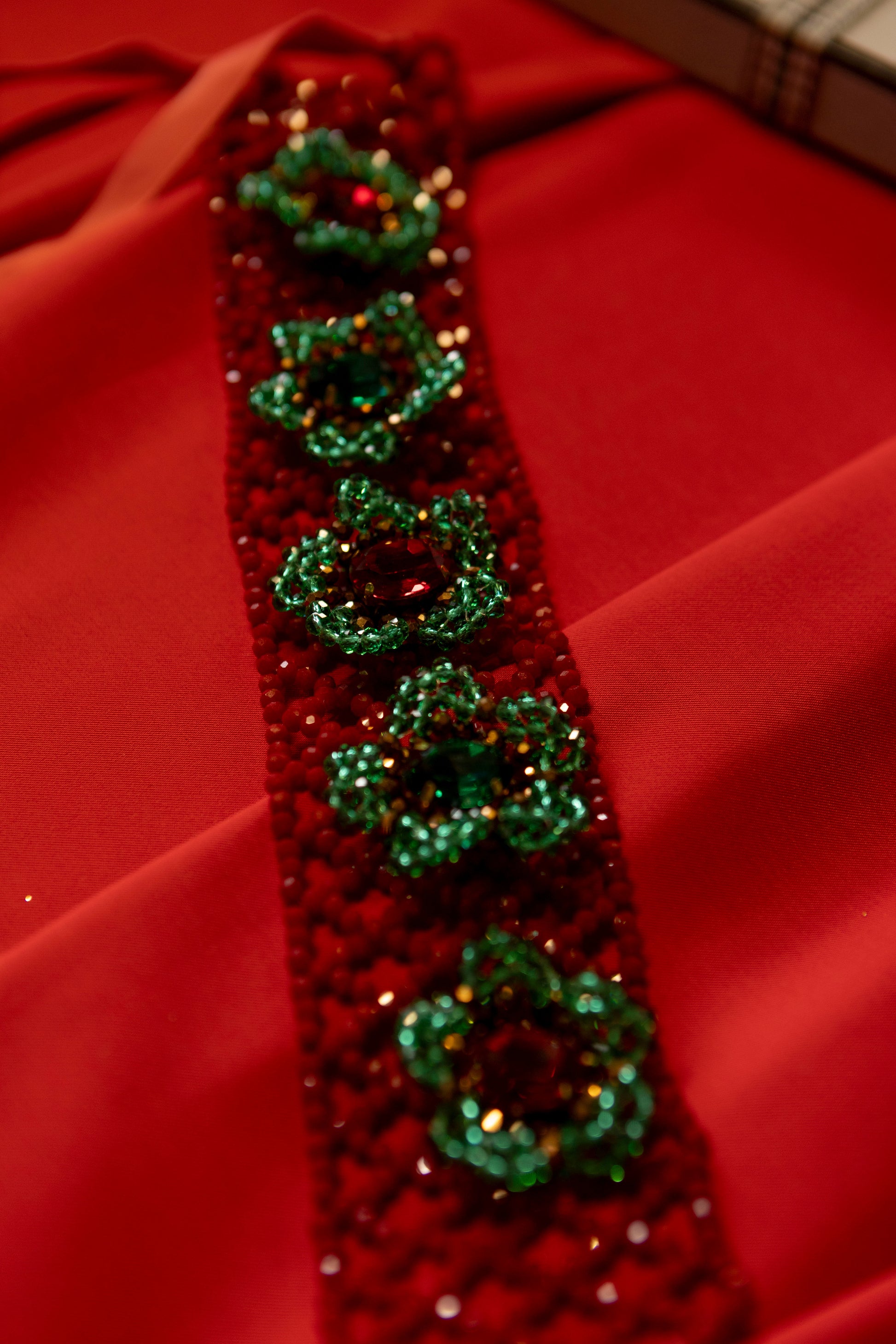 Чокер «Red Berry» — це прикраса з характером. Насичений червоний кришталь створює глибокий, соковитий акцент, а зелені кристалеві квіти з різнобарвними переливами додають образу живості та природної гри світла.